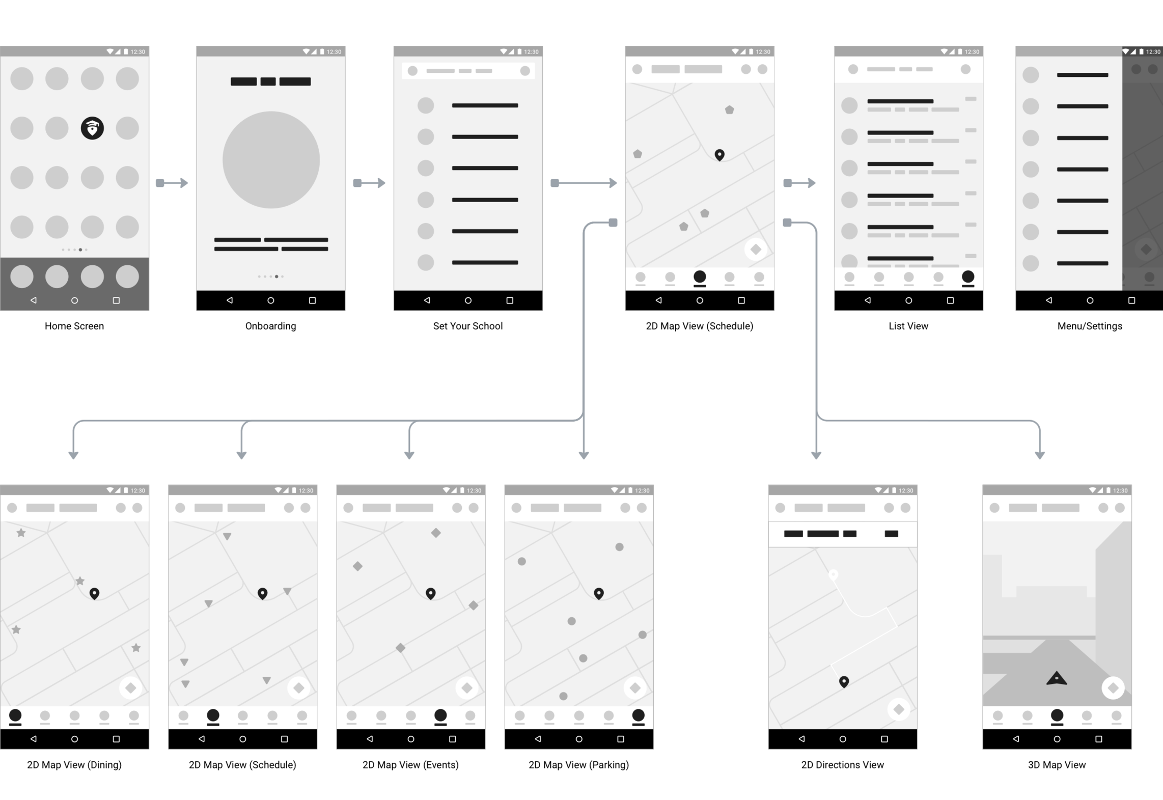 Another priority was flow. After getting onboard, users would pick their school and get dropped into the map. From here users could then filter visually, leave the map and enter a location search menu, or go back to search for another school.