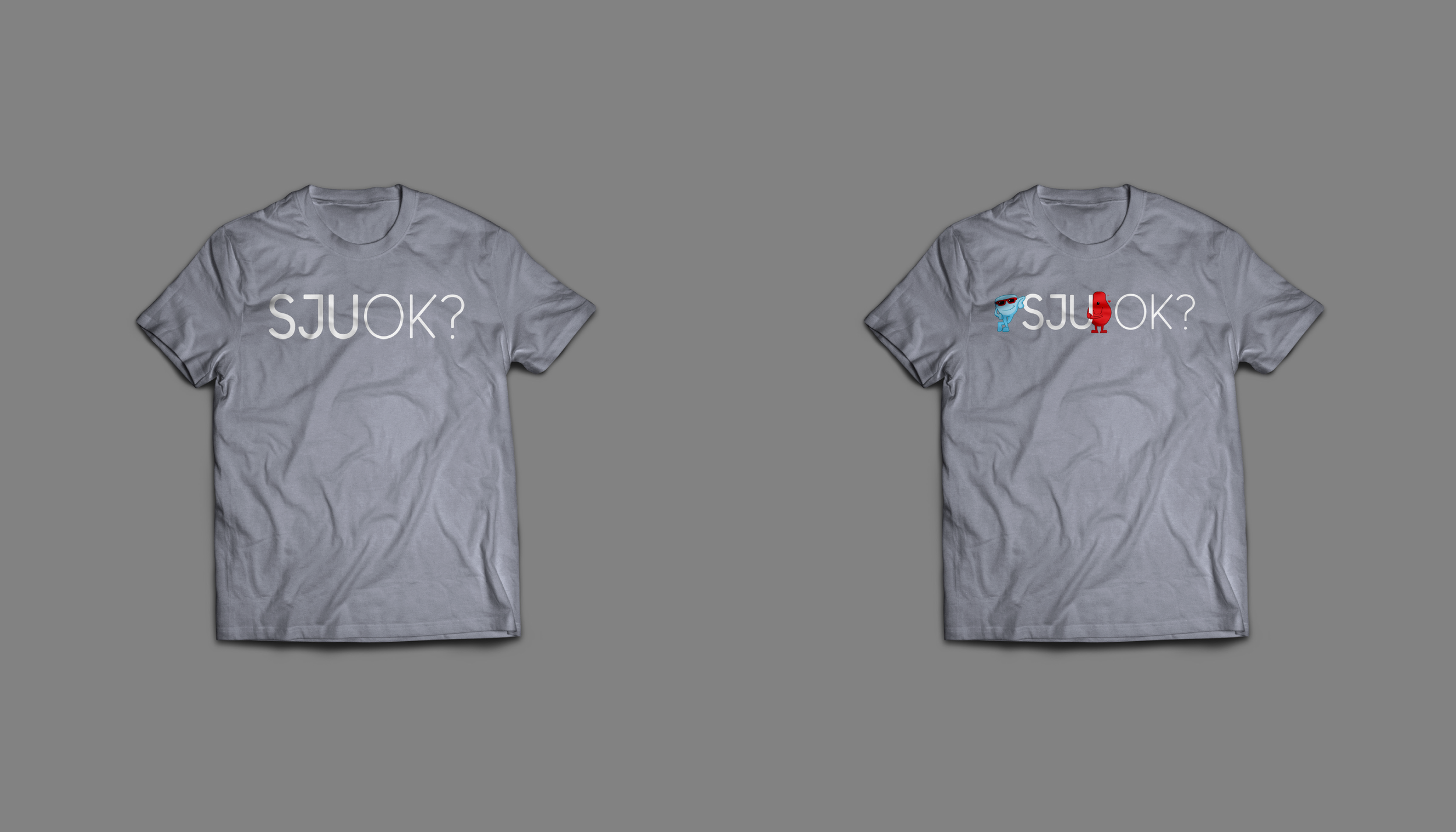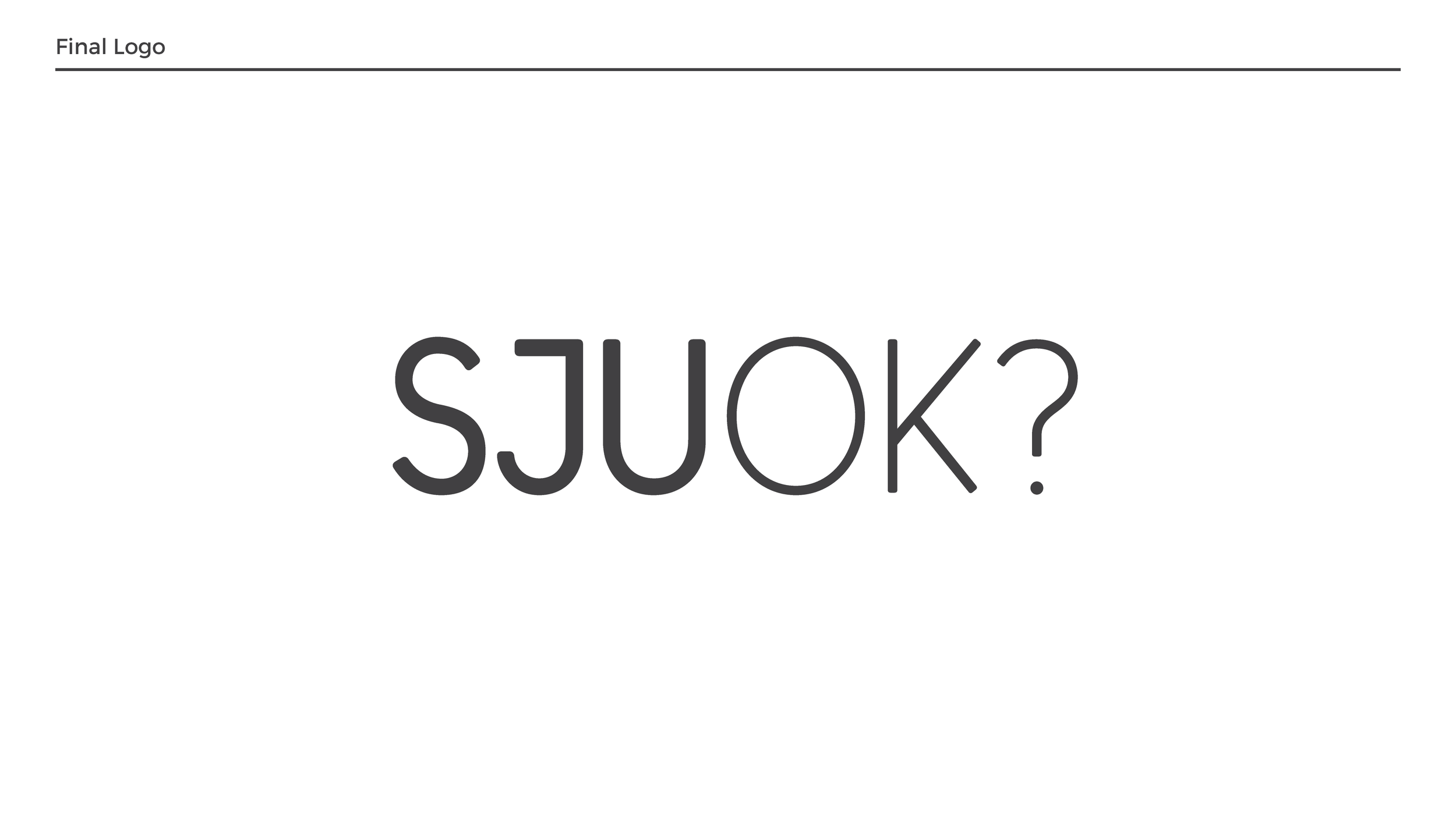 Based on the research results, and what we thought were the most important topics to address, we decided that the campaign must be approachable, friendly, and fun, while still being serious enough to discuss the matters at hand. For the identity we came up with multiple ideas that we then narrowed down to 6 names. The focus groups chose "SJUOK?" and expressed a preference for the one on the right (see image below). We thought that the round type seemed friendlier, but the sharper one seemed modern and more mature for a college audience. Liking certain aspects from each of these, I was tasked with redesigning the logo to address these issues.