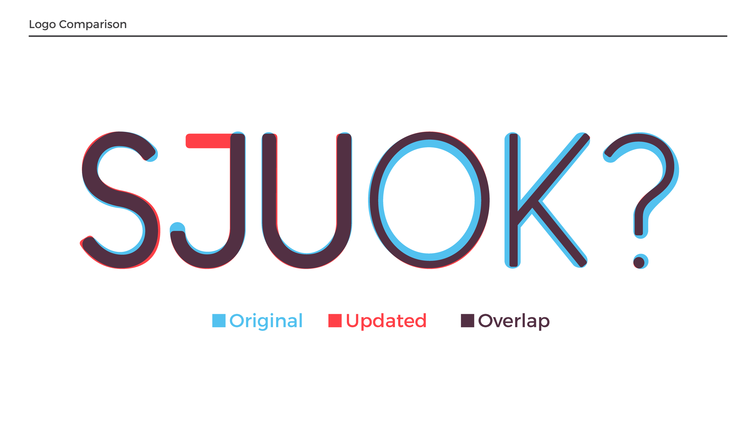 The result can be seen below both by itself and in comparison. I left the general skeleton of the letters intact because they had this quirkiness to them that was quite inviting such as the narrow "U" the stance of the "S" and the overreaching top arm of the "K." I opted for rounded corners to suggest friendliness while keeping the maturity of the previous sketch, and lastly adjusted the weights so that there was a clear separation between the "SJU" and the "OK?"