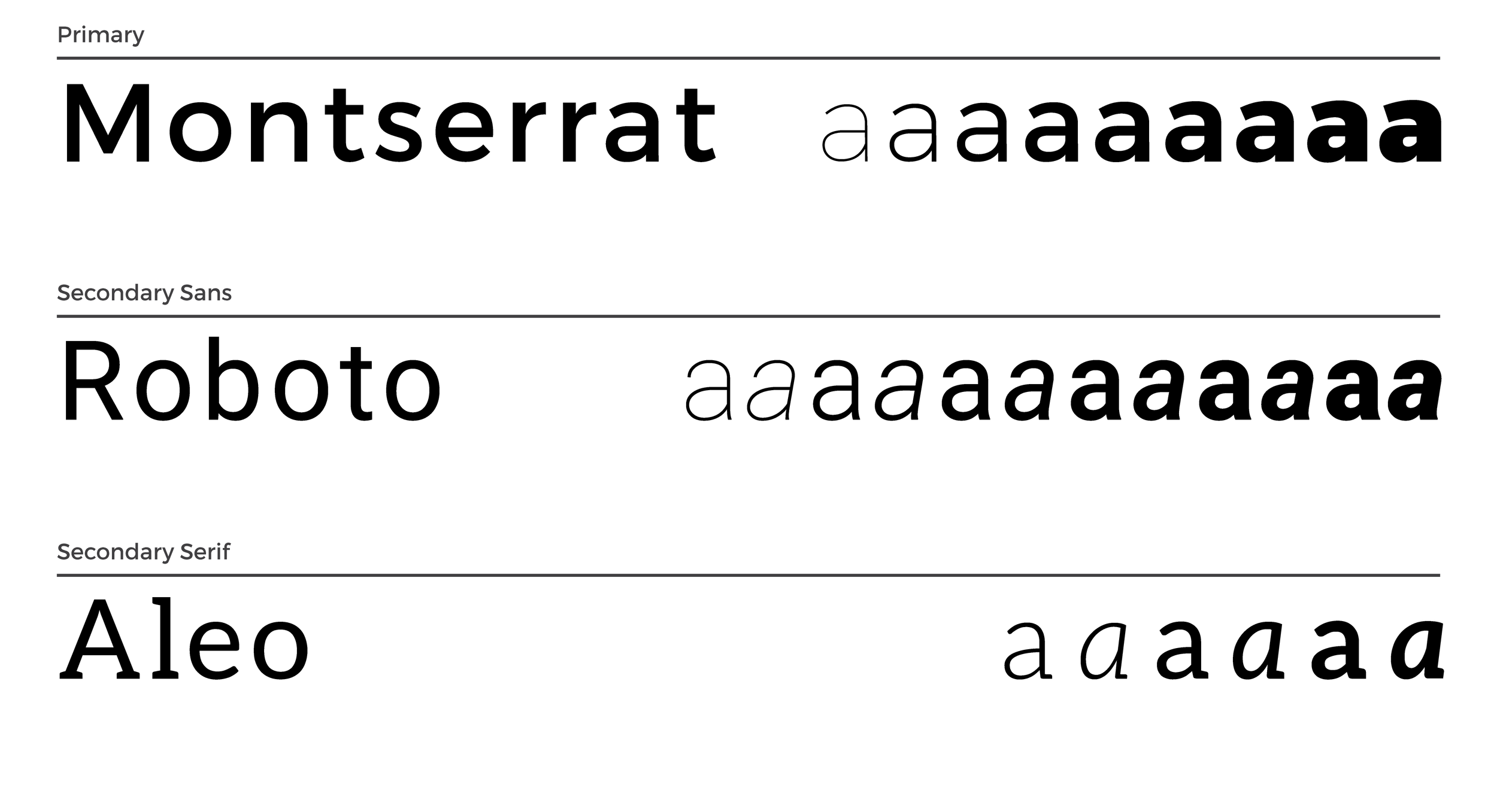 For this campaign we don't have a set typographic palette. We use Montserrat as our primary typeface with all others acting in a supporting role. Having to provide some guidance for new workers on the team in our brand book, I chose to include a secondary sans and serif. Roboto pairs nicely with Montserrat because its narrow width contrasts Montserrat's wider forms, while also offering a more organic tone. For the serif recommendation I wanted either a slab-serif or something with very thick serif approaching a slab. In order to maintain the proper look and feel I felt that anything too far from a slab did not provide the right feel for the campaign we were working on. For a while I considered using Bitter by Huerta Tipográfica, but went with Aleo because it had a light weight on top of regular and bold, giving it the capability to operate alongside Monserrat and Roboto which span the weight spectrum all the way to thin or hairline.