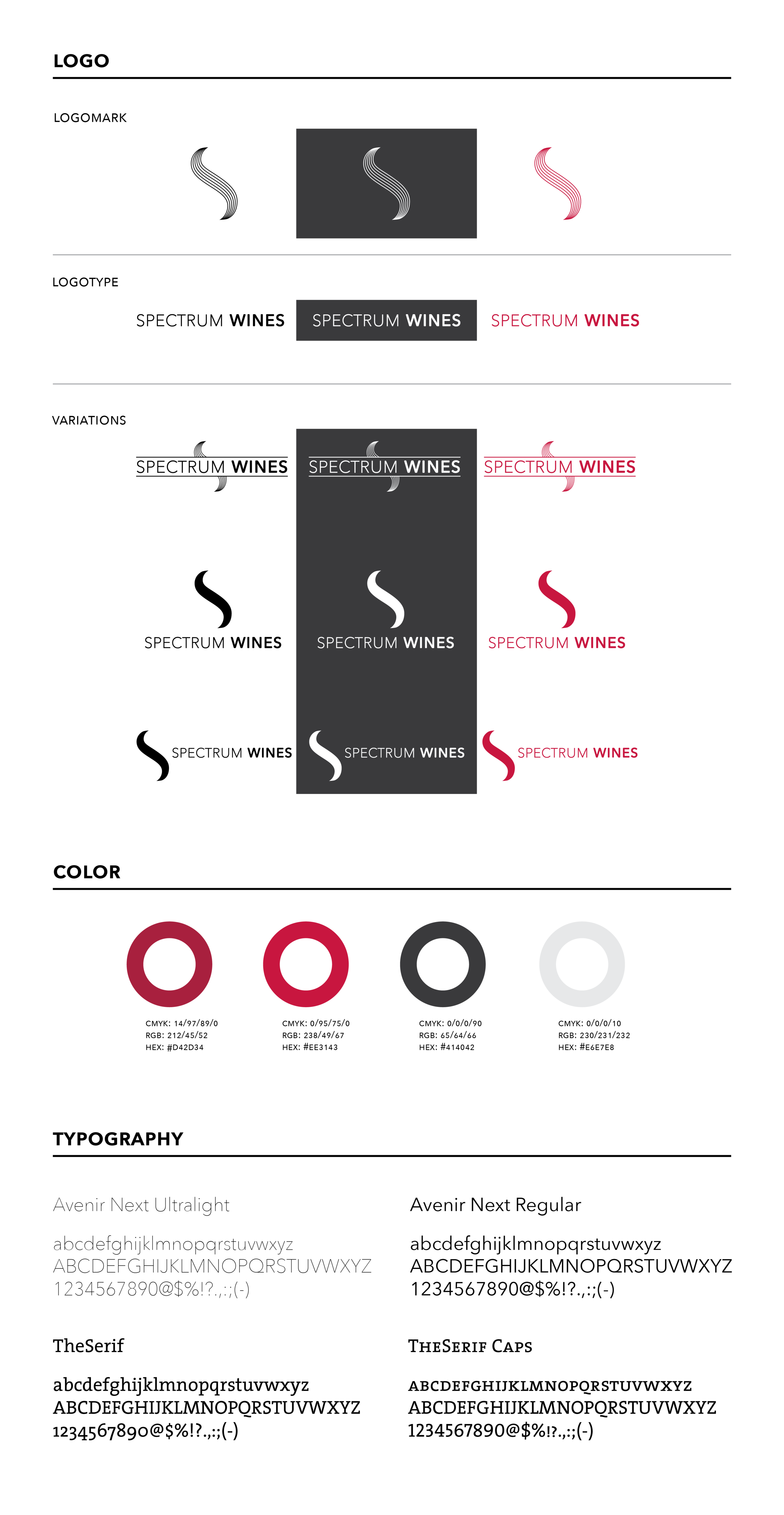 For color I opted for a deep red to associate the brand with wine. pairing that with a lighter red for wave patterns and then a 90% black for more depth and 10% black for wave patterns on white.