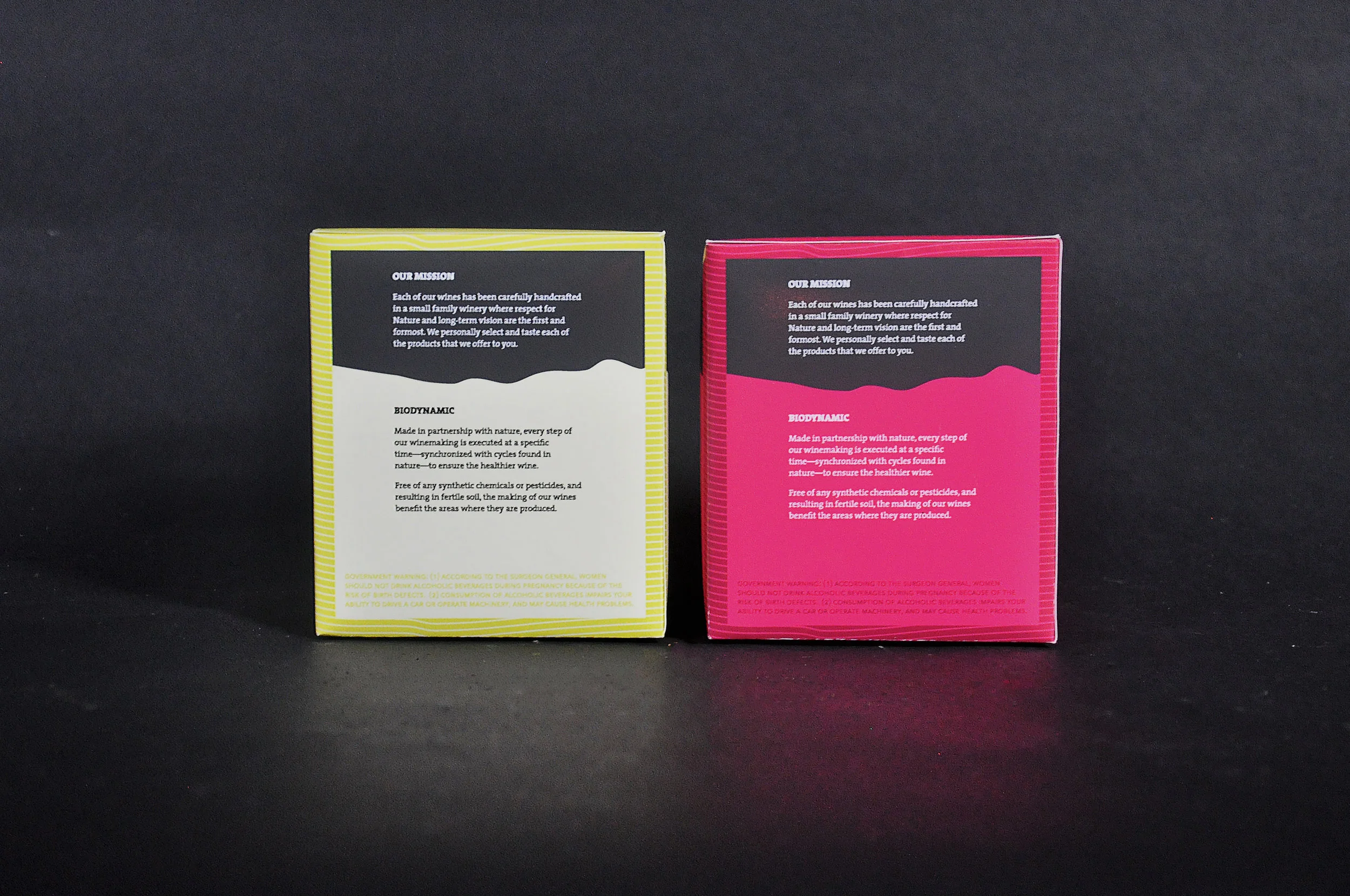 The goal of this project was ultimately to create an identity and packaging design for a fictitious boxed wine company. My research started with the product: biodynamic wine, its significance and the entirety of its process. Biodynamic is organic but goes several steps further such as making the wine in conjunction with the positions of the sun, moon, stars, and burying certain objects like cow horn to increase the fertility of the soil.